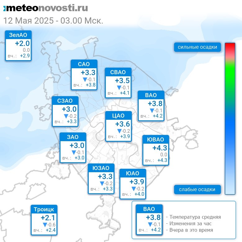 В 3:00 в Москве было от +1.8°C до +4.5°C, средняя температура +3.4°C #погода #Москва #весна #температура #12мая #понедельник