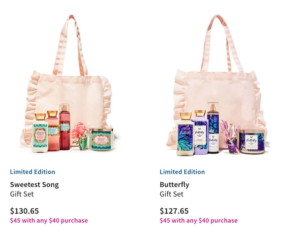 Ещё у Bath and Body Works вышли симпатичные сумочки с наполнением🔥 Они будут стоить 45д при условии покупки чего-либо на 40д 💫Sweetest Song Gift Set Как это пахнет: музыка, которая переносит вас в самый лучший день в жизни. Ноты аромата: сочная малина, кристаллы сахара и взбитый мускус. 💫Butterfly Gift Set Как пахнет: вдохновляющий полет в сладком, цветочном весеннем воздухе. Ноты аромата: малиновый нектар, лепестки ириса и воздушная ваниль.
