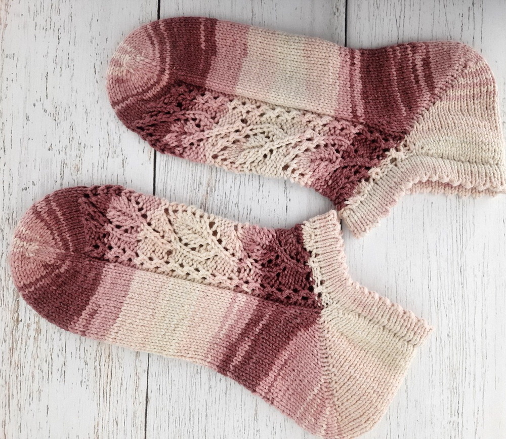 В этот раз вязала от мыска. Носочки получились немаленькие – на 39-40 размер. Набрать способом Джуди на спицы № 2,25 22 петли (по 11 петель на каждой спице) и сформировать мысок. Подробное описание этого процесса тут: Набрав расчетное количество петель, переходим к вязанию стопы. Верхнюю часть петель вяжем узором, а нижнюю – лицевыми петлями. Провязав нужное количество рядов для выбранного размера, перейти к вывязыванию пятки-бумеранг, которую вяжем на 35 петлях поворотными укороченными рядами с формированием двойных петель. Как вязать пятку-бумеранг, можно посмотреть тут: Для более плотного облегания в верхней части носка перейти на спицы № 2 и связать двойную манжету с зубчатым краем. Открытые петли манжеты пришить к изнаночной стороне кеттельным швом. Подробнее о том, как связать двойную манжету с зубчатым краем: Мне этот вариант не очень понравился. Край из этой пряжи все-таки получился толстоватым. К тому же кеттлевка открытых петель манжеты получилась не с первого раза. Под