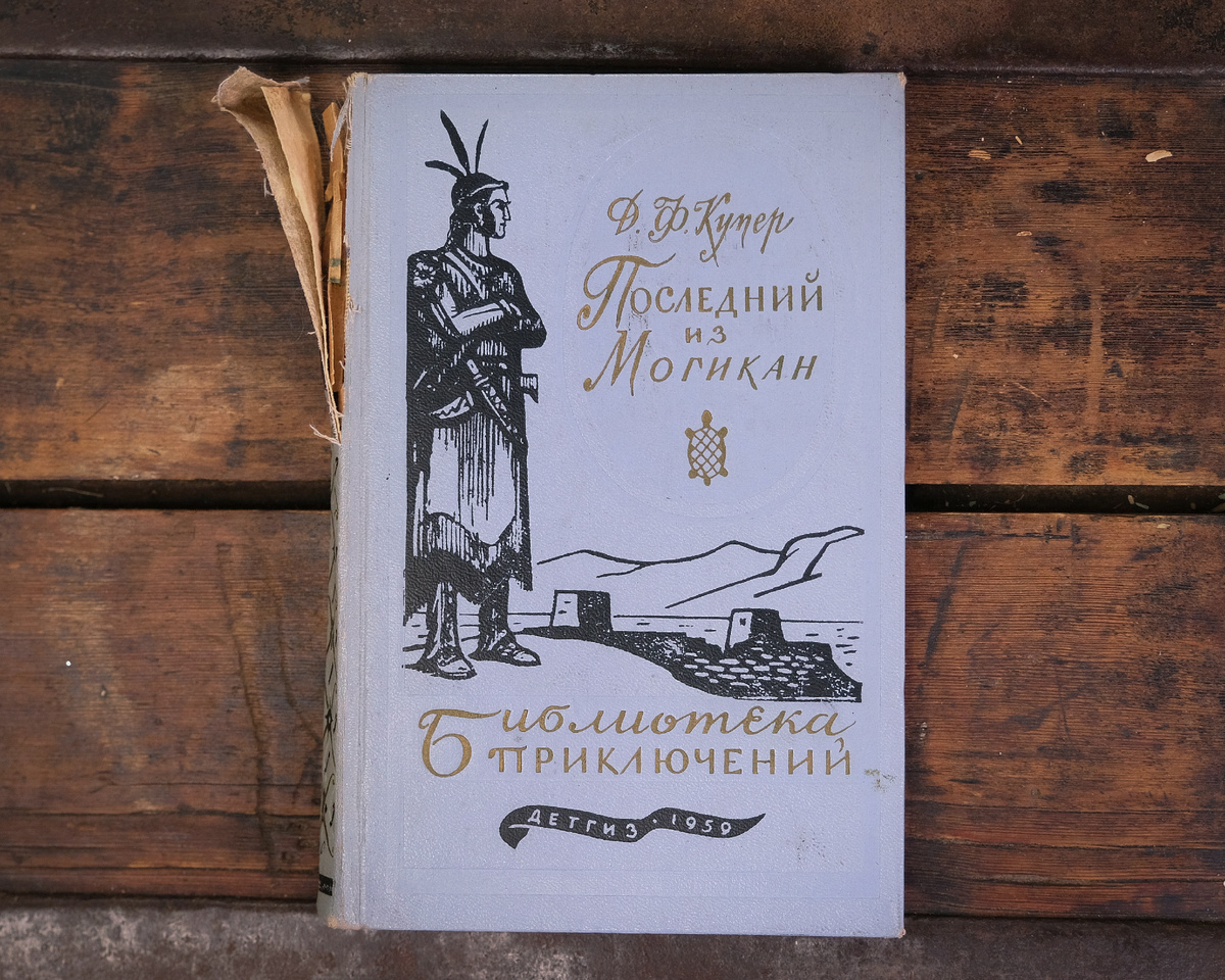 Мало кто в детстве не любил приключенческие романы. Эпоха юношества, толком или совсем не знавшая Интернет, щедро подкидывала нам романы Жюля Верна, Джека Лондона, Джонатана Свифта и многих других зарубежных и советских писателей. Томик Джеймса Фенимора Купера «Последний из могикан» пришёл в мастерскую прямиком из тех беззаботных времён, чтобы обрести у нас вторую жизнь. Удивительно, но произведения американского романиста имели читательский успех как в России 1840-х, когда писатель был ещё жив, так и в советские времена. Вот и книга датирована 1959 годом, а вышла она в рамках серии Детгиза «Библиотека приключений». Середина ХХ века выдалась для детской литературы нелёгкой: только-только наступала послевоенная оттепель между СССР и Западом, остро ощущался дефицит произведений отечественных авторов. В связи с этим Детгиз выпускал в среднем всего по три новых издания на одного советского ребёнка. Зато качество изготовления томиков не страдало: Детгиз обладал приоритетным правом формирова