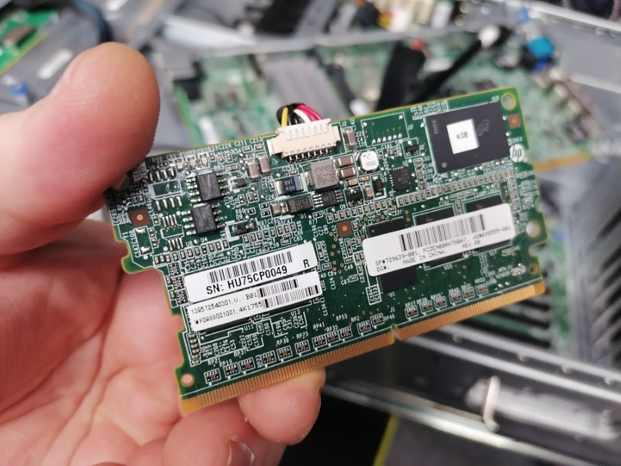 У нас на столе модуль кэш памяти HP 4GB FBWC Flash Backed Write Cache для контроллеров HP Smart Array P420/P421/P430/P431/P822/P830. Модуль выполняет несколько ключевых функций: Ускорение записи данных (Write Cache) Кэш-память 4GB FBWC временно сохраняет данные перед записью на диск, что значительно ускоряет операции записи (особенно в RAID-массивах уровней 5, 6 и 50, где требуется вычисление четности). Без кэша контроллер работает в режиме Write-Through (данные пишутся сразу на диск), что снижает производительность. Защита данных при отключении питания (Flash Backed) В модуле FBWC используется флэш-память и суперконденсаторы (или батарея). При аварийном отключении питания данные из кэша автоматически сохраняются во флэш-память и восстанавливаются после подачи питания. Это предотвращает потерю данных, которые не успели записаться на диск. Поддержка режима Write-Back (ускоренная работа RAID) Без FBWC контроллер работает только в Write-Through (медленная запись). С FBWC доступен Write-Ba
