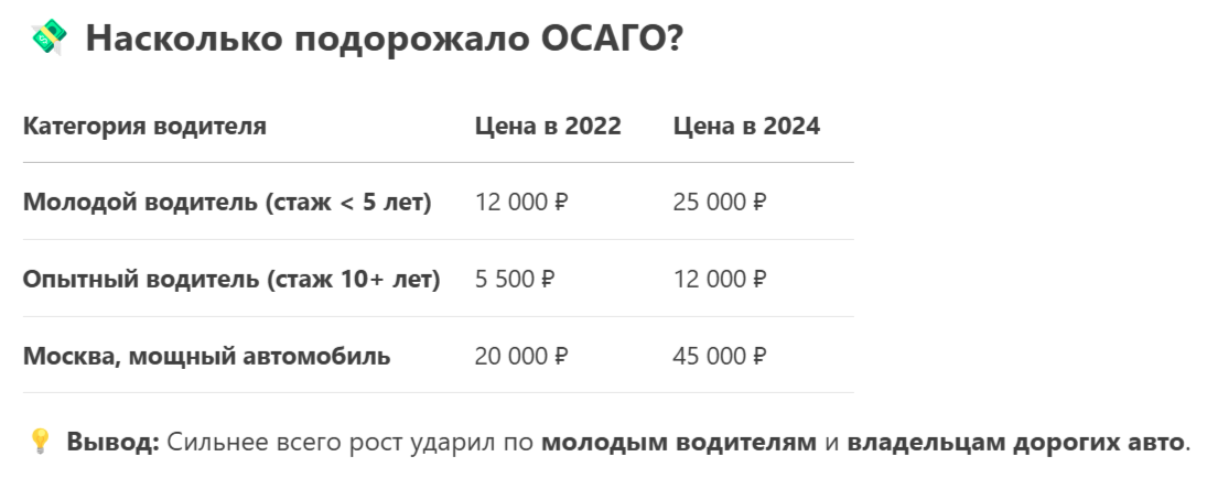 С 2023 года многие водители заметили резкий рост цен на ОСАГО — в некоторых случаях полисы подорожали в 2–3 раза. Почему так происходит, когда ждать снижения тарифов и как сэкономить на страховке? Разбираемся в деталях. 📈 Почему растут цены на ОСАГО? 1. Увеличение выплат по страховым случаям ✔️ Ремонт стал дороже — запчасти и работа СТО резко выросли в цене из-за санкций и курса валют. ✔️ Суды чаще встают на сторону пострадавших, обязывая страховые доплачивать. 📌 Пример: Раньше за разбитую фару платили 10 000 ₽, сейчас — 50 000 ₽. 2. Уход иностранных страховщиков ✔️ Allianz, Ingosstrakh (бывший Zurich) и другие сократили работу в РФ. ✔️ Остались в основном госкомпании (РСА, Согаз, АльфаСтрахование), у которых меньше конкуренции. 3. Новые правила расчета тарифов (с 2023 года) ✔️ Базовые ставки повысились (для Москвы — на 40–70%). ✔️ Коэффициенты стали строже (например, за возраст и стаж теперь можно получить не скидку, а надбавку). 📌 Совет: Проверьте свои коэффициенты на сайте Р