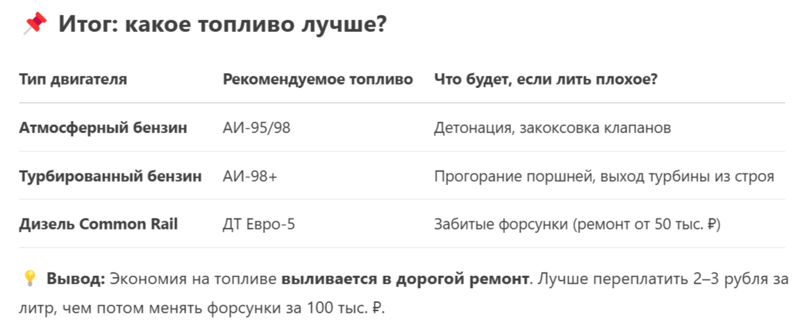 Качество топлива напрямую определяет срок жизни двигателя. Некачественный бензин или дизель могут привести к дорогостоящему ремонту уже через 50–70 тыс. км пробега. В этой статье разберём, как выбрать правильное топливо и продлить ресурс мотора. ⛽️ 1. Бензин: какой октан подходит вашему авто? Виды бензина и их особенности: ✔️ АИ-92 – минимально допустимый для большинства машин, но снижает мощность и повышает расход. ✔️ АИ-95 – оптимальный вариант для современных двигателей, сбалансирован по цене и качеству. ✔️ АИ-98/100 – для турбированных и спортивных авто, снижает риск детонации. 📌 Важно: Заливать бензин ниже рекомендованного октанового числа нельзя – это приведёт к: Детонации (разрушение поршней и клапанов). Загрязнению форсунок и камеры сгорания. ⛽️ 2. Дизель: на что обращать внимание? Ключевые параметры дизтоплива: ✔️ Цетановое число (не менее 45–50) – чем выше, тем плавнее работа мотора. ✔️ Сезонность (летнее/зимнее/арктическое) – неподходящее топливо парафинизируется и заб
