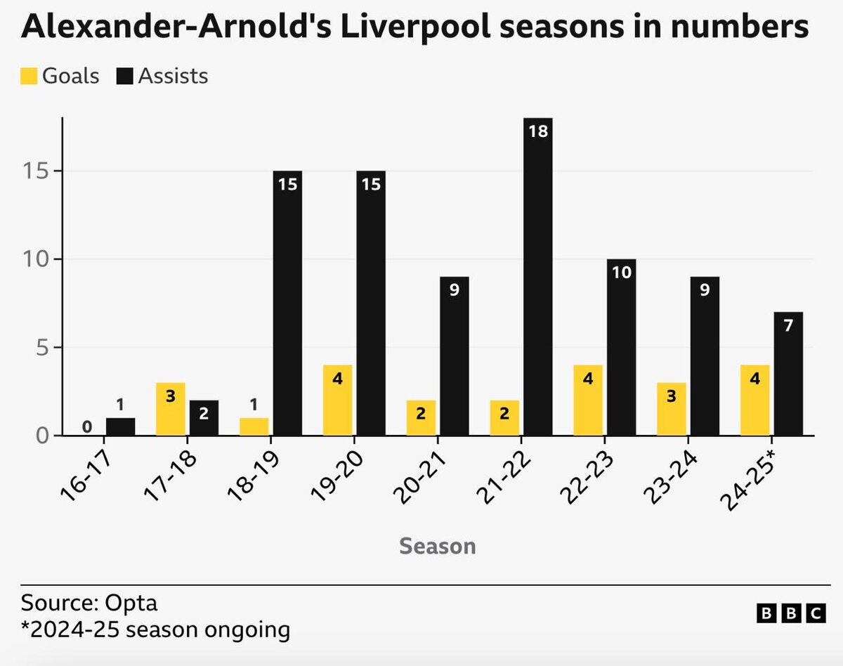 Показатели результативности Трента Александер-Арнольда в каждом сезоне за "Ливерпуль" 📊