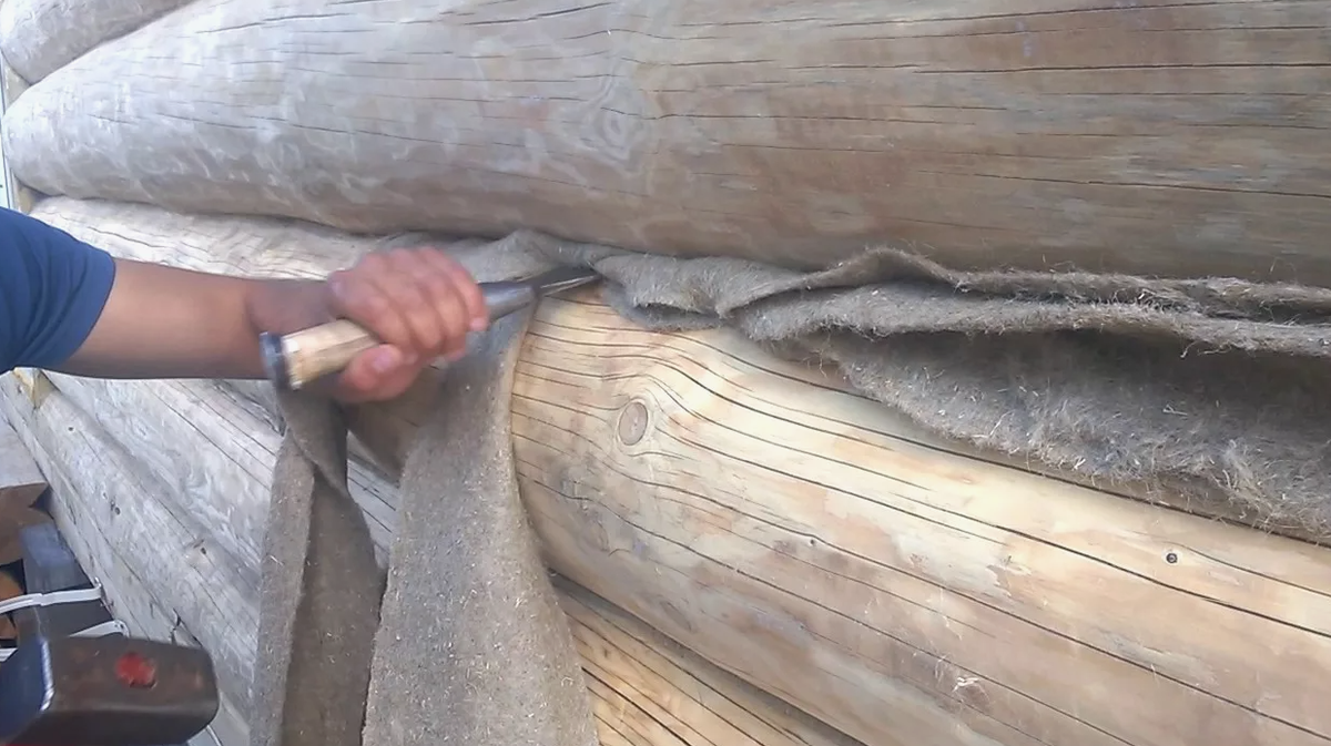 Выступающий мох срезайте ножом или топором для аккуратности. - Фиксация: Вбивайте гвозди в нижнее бревно вдоль швов с шагом 10–15 см. Гвозди удержат мох и создадут основу для раствора.