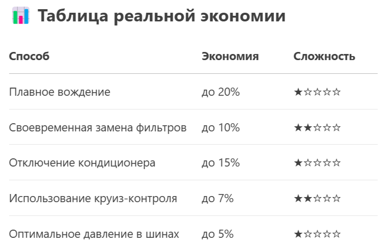 С каждым годом бензин дорожает, но это не повод пересаживаться на общественный транспорт. Мы собрали проверенные методы, которые помогут сократить расход топлива на 15-30% без радикальных мер. ⛽️ Почему ваш автомобиль "жрёт" больше нормы? Перед тем как экономить, стоит понять основные причины перерасхода: ✔️ Технические неисправности (забитые фильтры, старые свечи) ✔️ Агрессивный стиль вождения (резкие разгоны и торможения) ✔️ Перегруженный автомобиль (лишний вес + багажник на крыше) ✔️ Неправильно подобранное масло и топливо 🔧 5 технических способов экономии 1. Своевременное ТО Замена воздушного фильтра (+7% к расходу при загрязнении) Исправные свечи зажигания (+10% при износе) Правильное давление в шинах (снижение на 0.5 атм = +5% расхода) 2. Использование качественного топлива АИ-95 вместо АИ-92 часто даёт меньший расход Избегайте левых заправок — плохое топливо снижает КПД 3. Облегчение автомобиля Каждые 100 кг груза = +1 л/100 км Демонтируйте неиспользуемый багажник на крыше