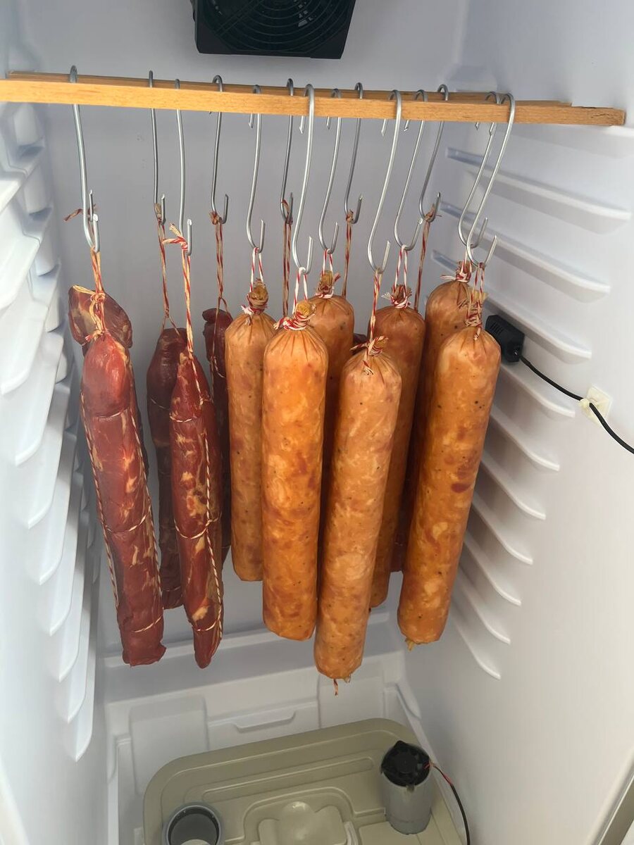 Где то неделю назад, а может чуток побольше собрал я свою климат камеру, но ничего не писал про нее ,тк испытывать не на чем было. (Стояла без дела. Ну как без дела, как холодильник работала, два холодильника это тема 😂) Приехав сдачи, привез с собой, как раз то, что можно разместить в ней: свиная вырезка рапид, будет весить до потери веса 35%-40%, ну и имбирная колбаска повешена на сушку.