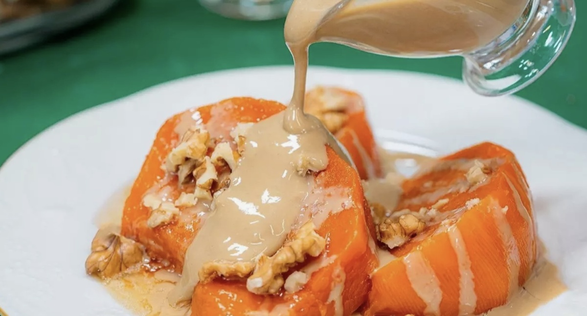 Да и подача меня удивила. На огромном блюде лежали полупрозрачные оранжевые кусочки тыквы, политые белым соусом из тахины и посыпанные зеленоватыми фисташками. Такое вот буйство красок и вкусов.