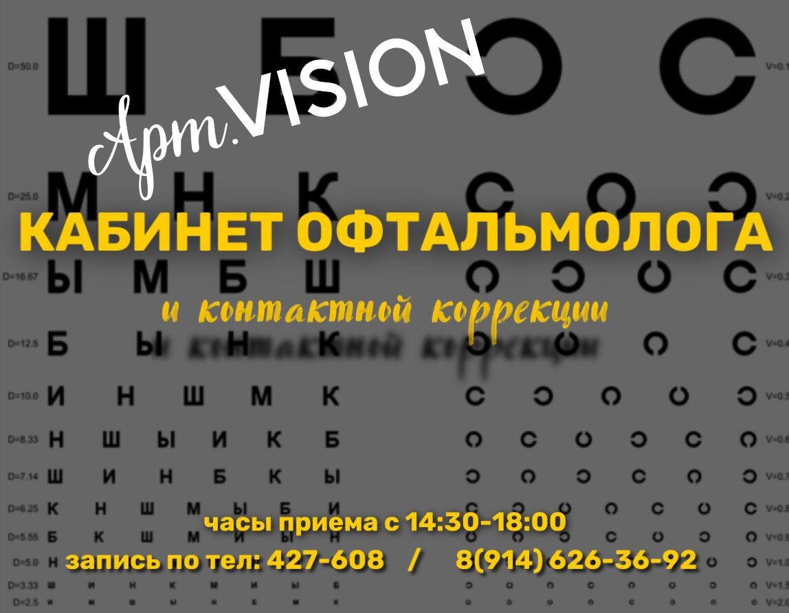 🔎Кабинет офтальмолога Арт.VISION 👨🏻⚕️Приём ведёт врач-офтальмолог высшей категории Туркин Артур Викторович 🔸Полное обследование взрослых 🔸Детский осмотр (5-18лет) 🔸Осмотр по жалобам 🔸Подбор/продажа контактных линз ⏰Часы приема с 14:30 до 18:00 📍ДБ Камчатка, Ленинградская, 100 401 офис; 4 этаж 📝Запись по тел: 427 608 ; +7(914) 626-36-92