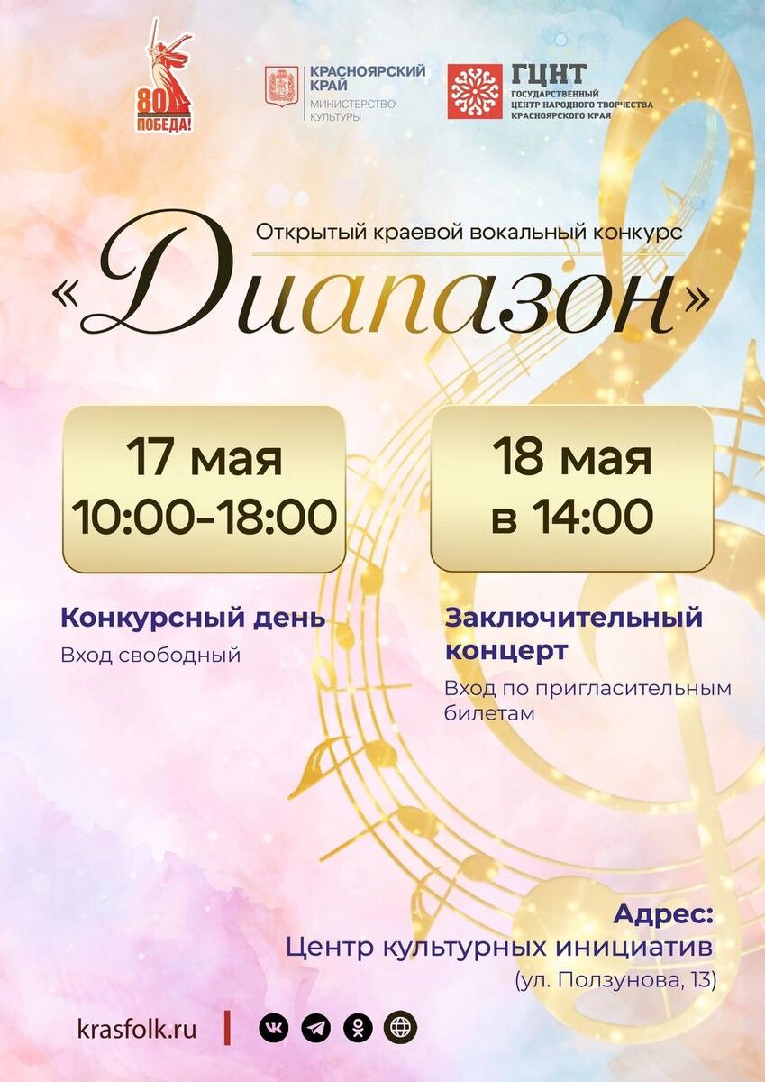 Приглашаем на открытый Краевой вокальный конкурс «Диапазон»! Почему стоит пойти? ✅ Услышать будущих звезд и признанных мастеров. ✅ Вдохновиться энергетикой живых выступлений. ✅ Поддержать участников со всего Красноярского края! 🎙17 мая с 9:00 до 18:00 — конкурсные просмотры | Вход свободный 🏆18 мая в 14:00 — заключительный концерт и награждение лауреатов | Вход по пригласительным билетам. Адрес: Центр культурных инициатив (ул. Ползунова, 13) Как забронировать пригласительный билет? 🔹Позвонить по телефону +7(391)221-89-09, +7 (923) 350-60-94 «Диапазон» – где рождаются голоса, покоряющие сердца! ❤️