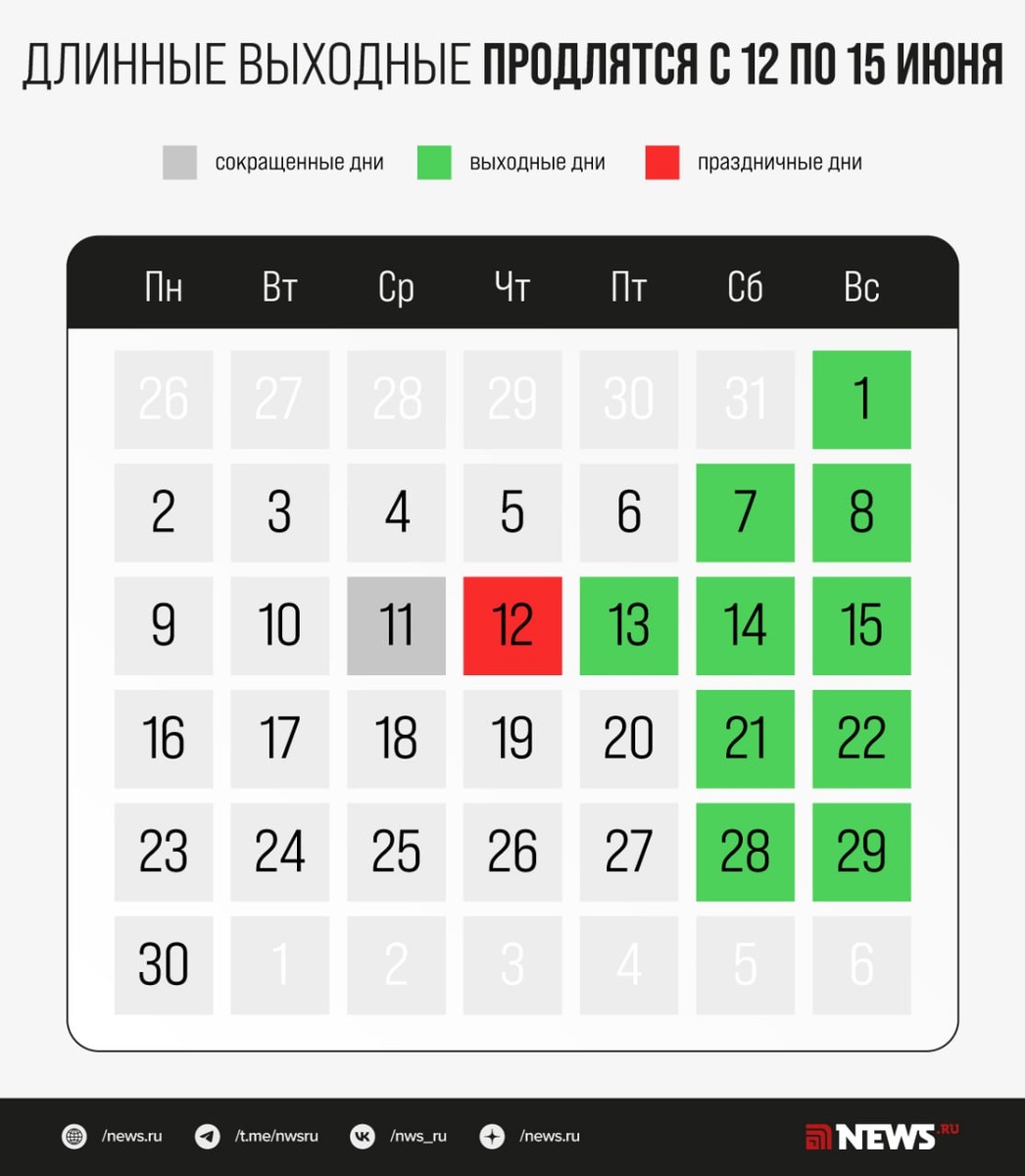 Стало известно, как граждане будут отдыхать на День России. В июне россияне смогут насладиться четырехдневными выходными благодаря празднованию Дня России. Отдых продлится с 12 по 15 июня, а предшествующая рабочая неделя будет сокращенной. В соответствии с постановлением правительства, выходной день с субботы 8 марта перенесен на понедельник 13 июня, что создает непрерывный период отдыха с 12 по 15 число. ⭕️ Подписаться | Прислать новость | Буст