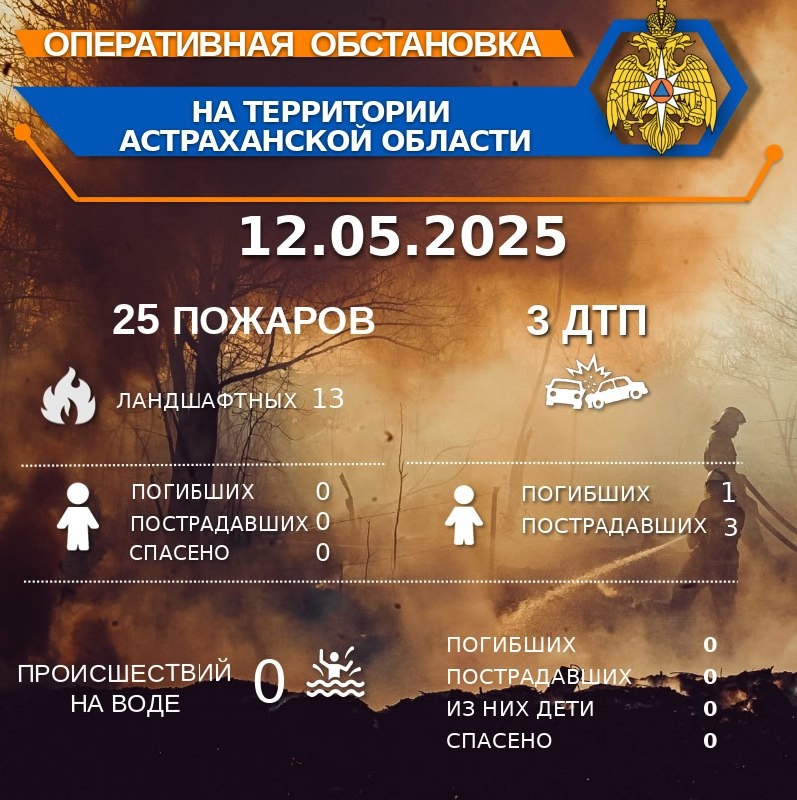 🚨Оперативная обстановка на территории Астраханской области по состоянию на 00:00 12.05.2025🚒