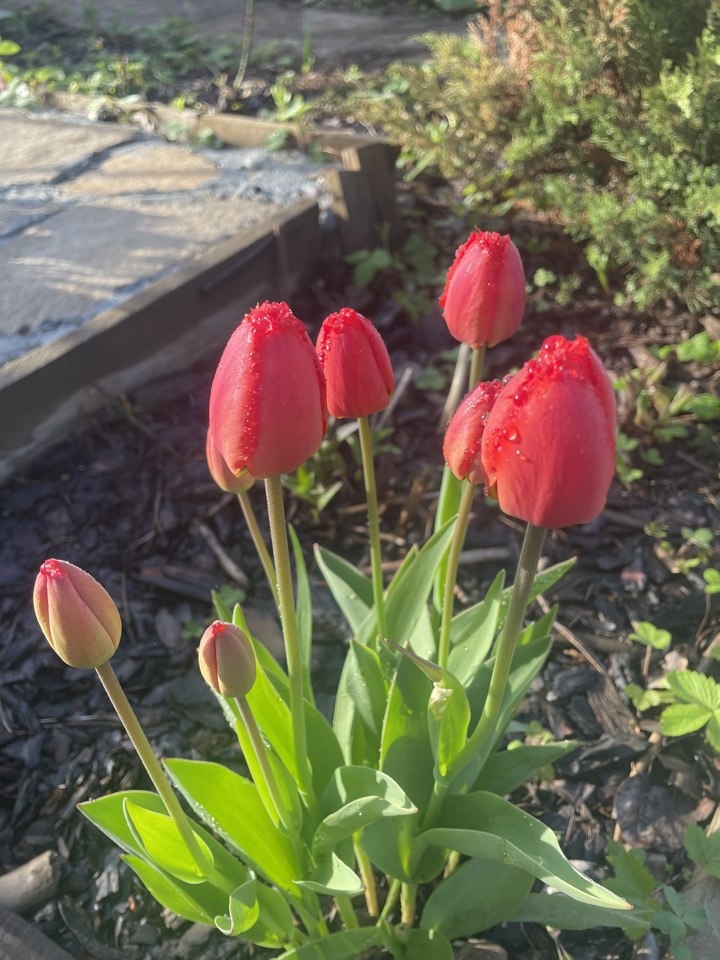 Добрый день, дорогие цветоводы! Длинные выходные, прохладные и с дождями, закончились, а у нас наконец-то выглянуло солнце и прогноз погоды обещает тепло. Сад преображается благодаря нашим трудам, расцветает весенними красками. Петунии в кашпо бодрые, неплохо перенесли дожди, ведь во всех кашпо обязательно есть хороший дренаж, и сейчас на солнышке активно пойдут в рост и цветение. Но особо рады такой дождливой и прохладной погоде хризантемы мультифлора, в этом году я высадила в грунт более 30 кустов, хочу получить цветущий бордюр из разноцветных шаров (как на фото из интернета – получится?). И это как раз тот случай, когда очень хорошо будет смотреться именно не упорядоченное разноцветье, поэтому сорта и расцветки здесь не так важны (помните, я не подписала горшки с сортами, и теперь любое цветение хризантемы – сюрприз)😊 Садовые многолетники набирают силу, пионы активно раскрывают носики, тюльпаны только поднимают бутоны, а вот солнечные нарциссы уже вовсю показали свою красоту. Нарци