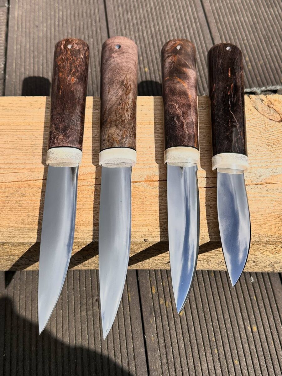 Всем доброе утро! В свободной продаже четыре ножа северных. Выполнены ножи из отечественной инструментальной стали х12мф с крио. С одной стороны полные спуски от обуха с долом. С другой стороны маленькая вогнутая линза. Рукоять на каждом ноже выполнена из стабилизированной карельской березы коричневой. Ножи заточены в бритву. Твердость клинка (HRC): 61-62 Цена за нож: 7.500 рублей. В комплекте идут ножны из натуральной кожи. Для заказа писать на @Nazarklinokbot или по тел +79101343831 WhatsApp/Viber