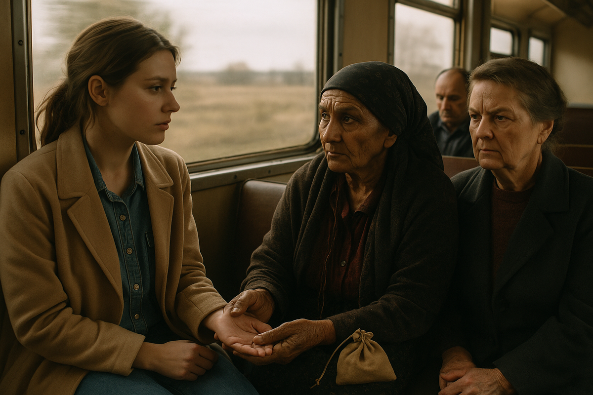 Цыганка тяжело опустилась на сиденье, вытащила из сумки тканевый мешочек, перебирая какие-то бусины. Несколько минут никто не говорил, пока цыганка вдруг не подняла глаза на Полину: