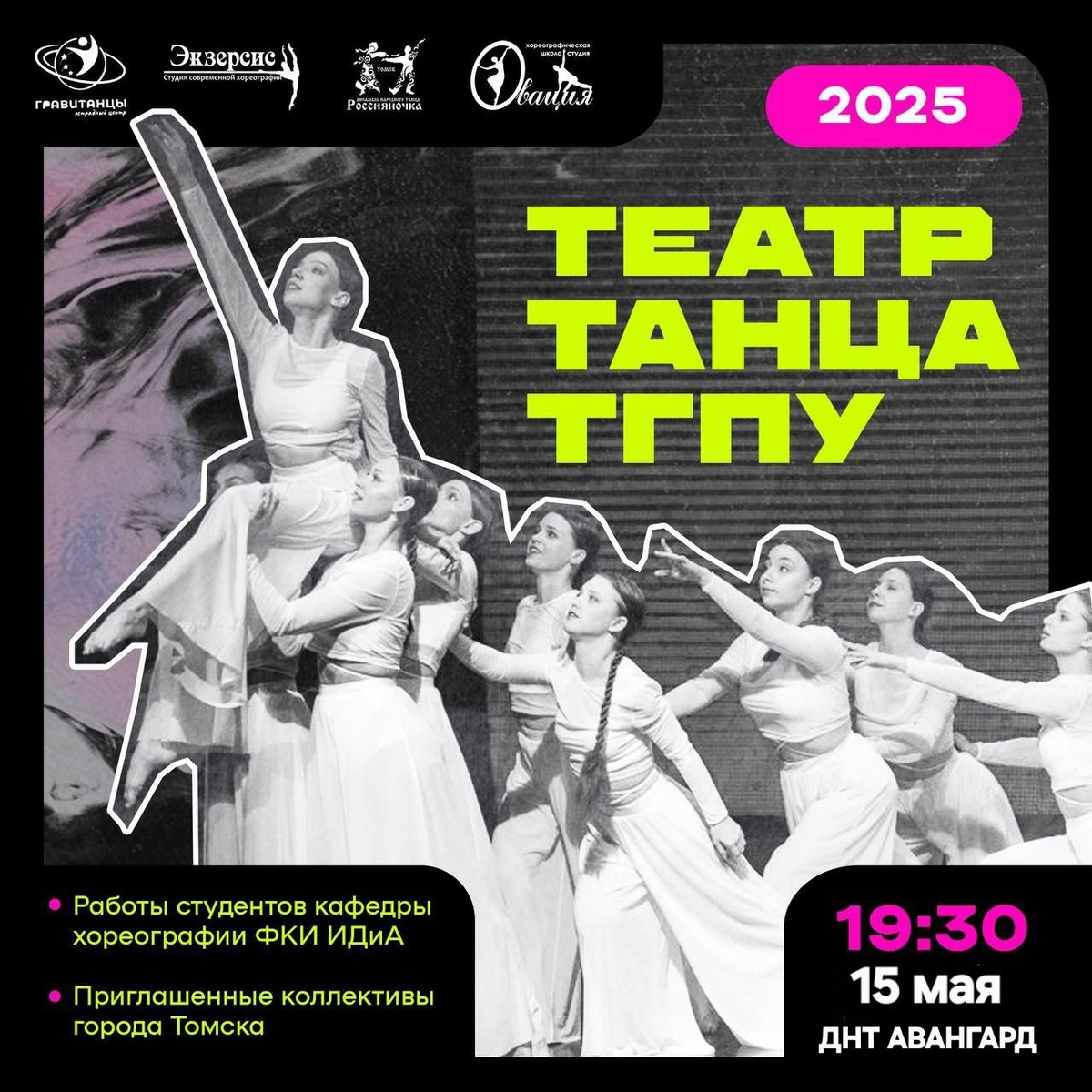 15 мая выступаем в программе концерта у замечательного коллектива, приходите 💕 Билеты: https://tickets.afisha.ru/wl/779/api#/about/134494 Театр танца Томского государственного педагогического университета приглашает на свой первый концерт, который коллектив посвящает Международному дню танца! В программу войдут полюбившиеся зрителям танцевальные номера, премьеры, свежие работы студентов кафедры хореографии Факультета культуры и искусств, а также выступления известных танцевальных коллективов города Томска: - эстрадного центра «Гравитанцы», - студии современной хореографии «Экзерсис», - ансамбля народного танца «Россияночка», - хореографической школы-студии «Овация» Ждём всех, танцев мало не бывает ✨