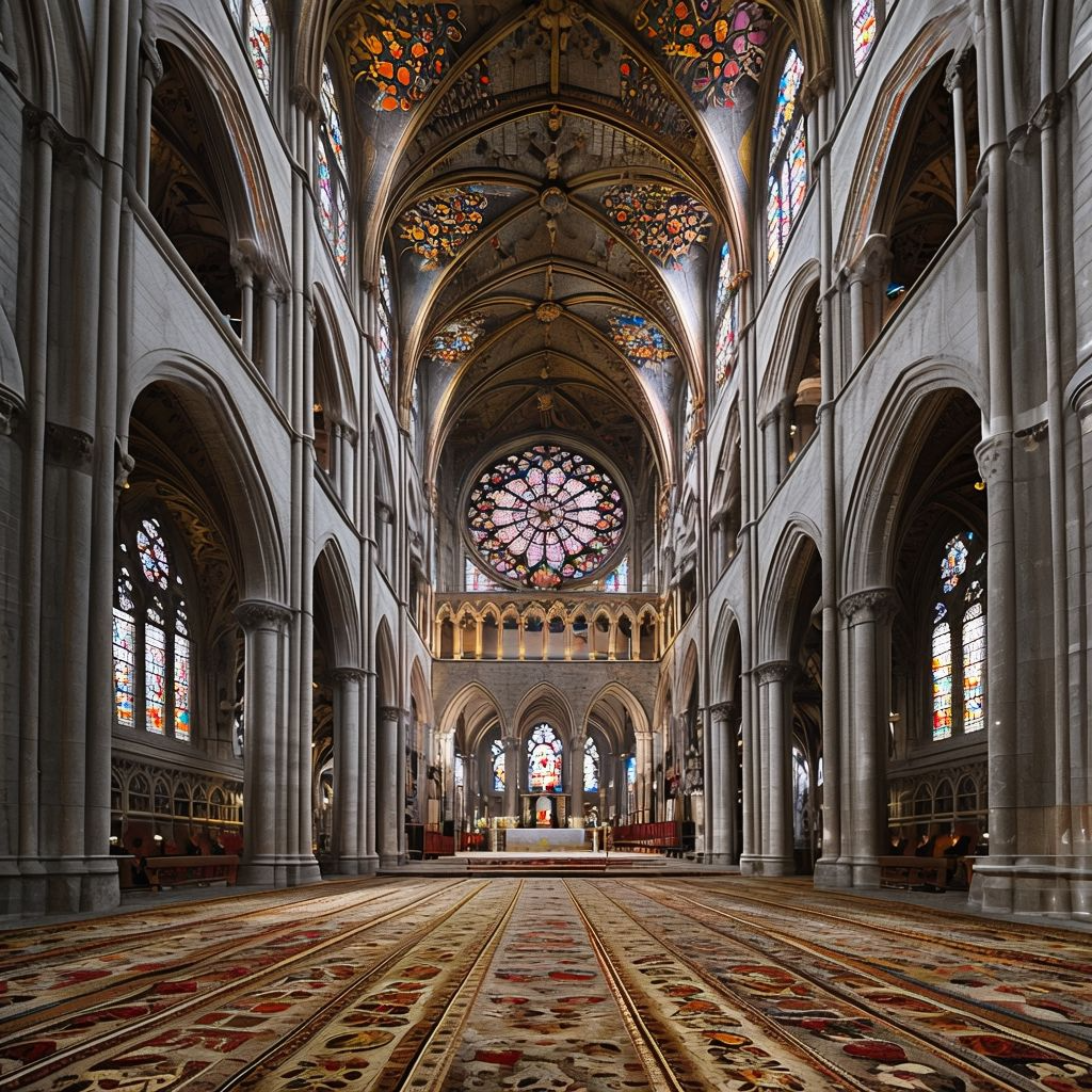 Колонны внутри храма разветвляются, как деревья, создавая удивительный "каменный лес". Свет, проходящий через витражи, наполняет пространство цветными пятнами, напоминающими солнечные лучи, пробивающиеся сквозь листву.