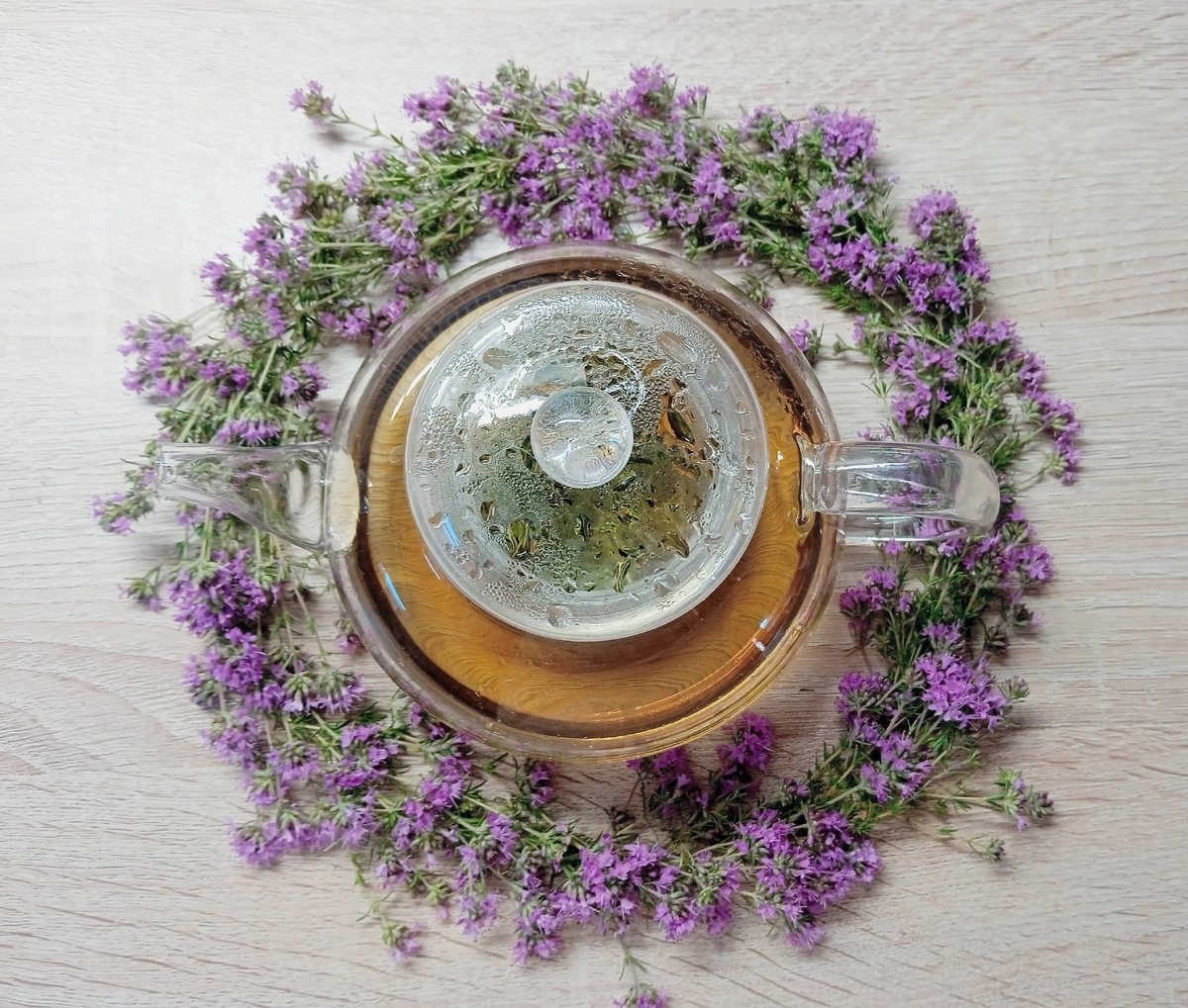 Положите чайную смесь (чабрец, мяту и ромашку) в заварочный чайник. Залейте кипятком и дайте настояться примерно 7–10 минут.