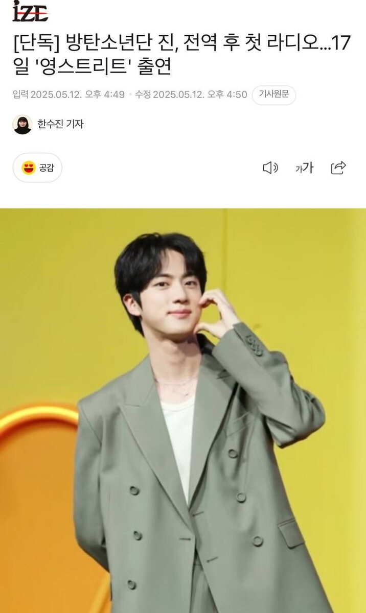 🔮 Джин появится в качестве гостя на шоу "Wendy's Youngstreet" на SBS Power FM 17 мая. Это часть его камбэк-активности для второго мини-альбома "Echo", который выйдет 16-го числа. Это также его первое появление на отечественном радио после увольнения из армии. У Джина и диджея из Youngstreet Венди есть давняя музыкальная связь. В прошлом году они представили сладкую гармонию в дуэтной песне "Heart on the Window", вошедшей в сольный альбом Джина "Happy", и получили большой отклик поклонников за их совместное живое выступление на фан-шоукейсе, состоявшемся на Jangchung Arena в Сеуле. Это появление на радио знаменует официальное воссоединение двух артистов спустя примерно полгода. Ожидается, что Джин поделится различными историями о своем новом релизе "Echo" во время трансляции. Ожидания также высоки из-за его фирменного остроумия и теплого общения. #JIN 🕊️🌱[https://dzen.ru/id/5f3ce54ccaeef80d2efd6e05]🌱🕊️