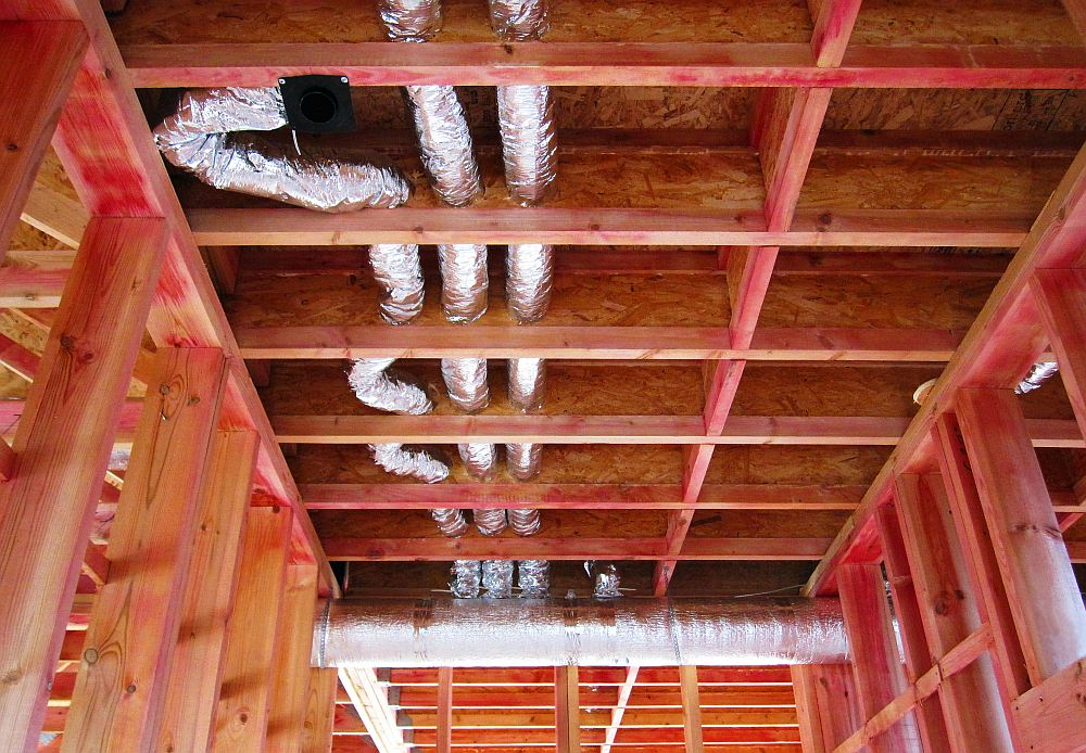 Трубы желательно монтировать на этапе черновой внутренней отделки, чтобы прокладка вентиляционных систем не повредила ремонту. Поэтому очень важно определиться со схемами циркуляции воздуха уже к началу строительства.