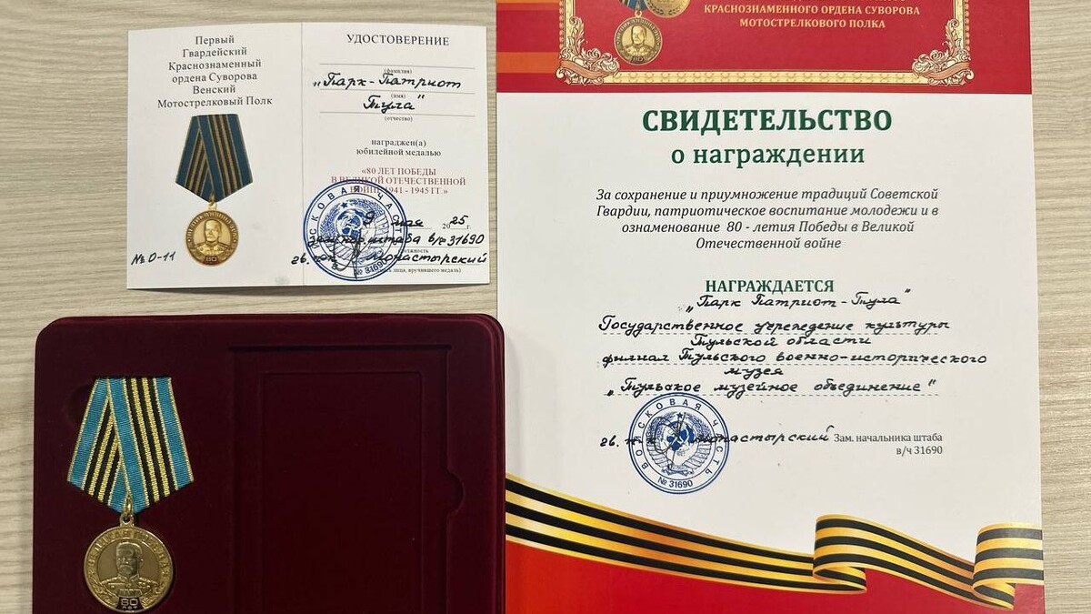В честь 80-летия Победы в Великой Отечественной войне парк «Патриот» в Туле был удостоен юбилейной медали. Эта награда была вручена за сохранение традиций Советской гвардии и воспитание молодёжи в духе патриотизма. В парке регулярно проводятся мероприятия, посвящённые военной тематике, уроки мужества и встречи. Здесь активно взаимодействуют молодёжные и волонтёрские организации, творческие коллективы, театры и образовательные центры. Медаль была учреждена Союзом ветеранов 1-го гвардейского Краснознамённого ордена Суворова Венского мотострелкового полка. Этот полк был сформирован в составе 100-й дивизии и с первых дней войны принимал участие в боевых действиях. За проявленные мужество и героизм он был награждён орденом Красного Знамени. В 1992 году полк был расформирован. По информации пресс-службы Тульского музейного объединения.