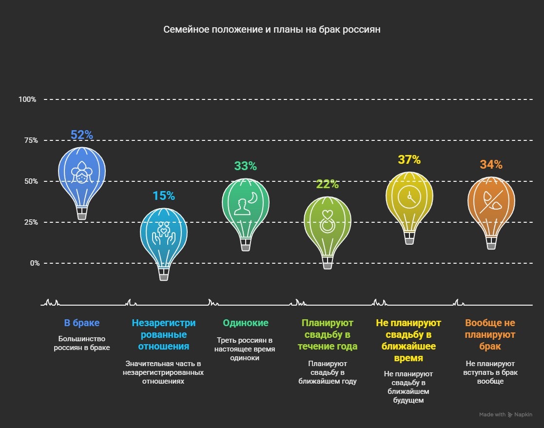 Выяснилось, что больше половины россиян – 52% – в браке. Еще 15% выбрали формат незарегистрированных отношений, а треть населения (33%) пока что одиноки.