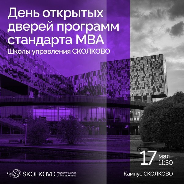 17 мая в Школе управления СКОЛКОВО ждут предпринимателей и управленцев, топ-менеджеров и владельцев бизнеса, амбициозных профессионалов и лидеров в своих сферах. Добро пожаловать на День открытых дверей программ стандарта МВА в Школе управления СКОЛКОВО — полезный разговор для тех, кому интересно дальнейшее развитие и получение бизнес-образования мирового стандарта МВА. Программа SKOLKOVO MBA помогает предпринимателям и управленцам менять мышление, развивать навыки, необходимые для управления завтрашним днем, и погружает в среду, где рост и визионерство — естественное состояние. SKOLKOVO Executive MBA — программа для топ-менеджеров и владельцев бизнеса с опытом более восьми лет, которая позволяет выйти на новый стратегический уровень своего развития с помощью фундаментального бизнес-образования. В программе — выступления руководителей программ Булата Нуреева, Ивана Хворова и Дмитрия Титарева, а также выпускников. Гостей ждут презентации программ, сессии вопросов и ответов, экскурсия