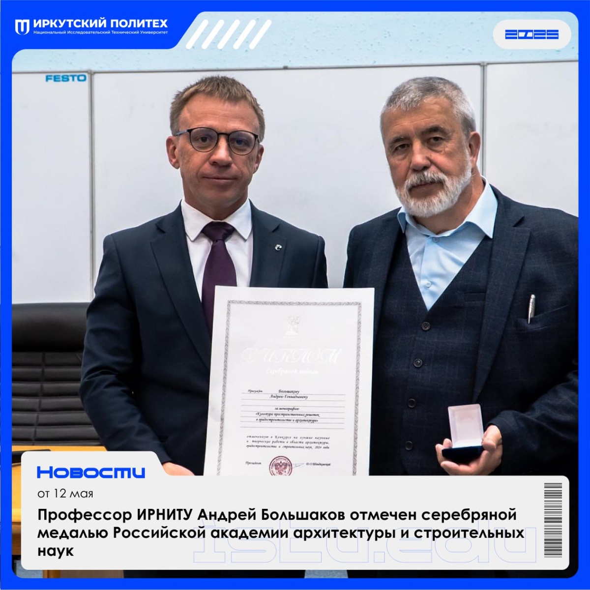 Актуальная подборка новостей ИРНИТУ за 12 мая! 🌿 Профессор ИРНИТУ Андрей Большаков отмечен серебряной медалью Российской академии архитектуры и строительных наук 🌿 Команда Геологоразведочного техникума ИРНИТУ - лидер региональной олимпиады по инженерной геодезии 🌿 Всероссийский конкурс «Современные проблемы науки, техники и культуры сквозь призму языкового сознания» состоялся в ИРНИТУ 🌿 ИРНИТУ организовал хакатон по цифровизации городского планирования для студентов ИРНИТУ и ИГУ 🌿 Участники первого выпуска «Полюс-класса» ИРНИТУ побывали на месторождении Сухой Лог и Вернинской золотоизвлекательной фабрике 🌿 Сборная ИРНИТУ впервые выиграла чемпионат Иркутской области по мини-футболу Листайте карточки!