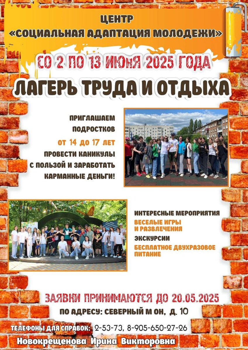 С 2 по 13 июня центр «САМ» организует в Борисоглебске лагерь труда и отдыха для подростков в возрасте от 14 до 17 лет. Это отличная возможность провести первые дни лета с пользой, активно и завести новых друзей. Хотите, чтобы ваш подросток провёл каникулы с пользой — лагерь труда и отдыха станет прекрасным решением!