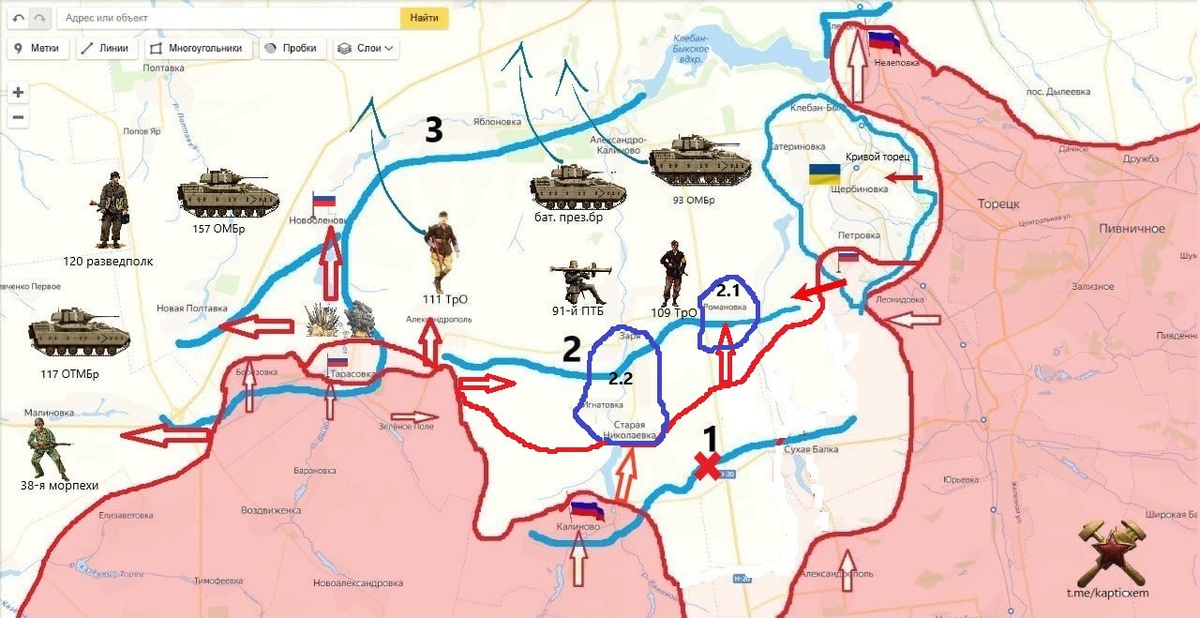 В ответ на пост Западнее Дзержинска (Торецка) ВС РФ приступили к ликвидации большого кармана (изменения) На рубеже обороны №2 у противника осталось по сути два больших узла: 2.1-Романовка и 2.2-треугольник Заря-Игнатовка-Ст.Николаевка. За них идут интенсивные бои. Никаких мешков, котлов, окружений в укрепах рубежа №1 нет. схемы и карты