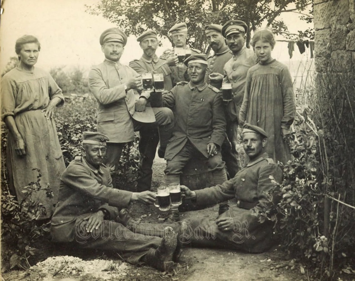Немецкие солдаты с местными жителями во Фландрии или Северной Франции, июнь 1917 года