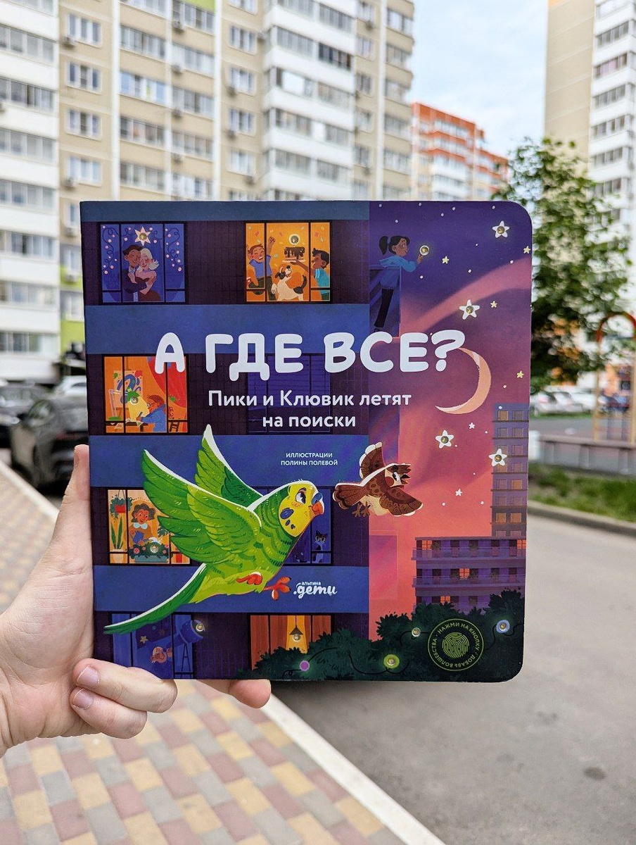 А ГДЕ ВСЕ? Пики и Клювик летят на поиски 🦜 Книга, в которой малыш сможет узнать любимые места – детскую площадку, магазин, кафе и детский сад. А еще, чтобы добавить немного волшебства в чтение, есть специальная кнопочка, включающая фонарики на обложке. ⭐ Волнистый попугайчик Пики очень взволнован: его любимые хозяева ушли и оставили его дома совсем одного. Куда же они отправились из их уютной квартиры так надолго? Смелый и любознательный Пики решает лететь на поиски. А поможет ему новый друг – воробей Клювик, настоящий пернатый детектив и специалист по множеству вопросов. Вместе с главными героями читатели побывают на детской и спортивной площадках, пешеходном бульваре, в детском саду и других местах, а заодно узнают, что делает дворы такими комфортными и интересными. Замечательный виммельбух для самых маленьких. В нем шесть ярких разворотов, наполненных захватывающими событиями путешествия, а в специальных окошках спрятаны интересные факты. Издательство Альпина. Дети #книги