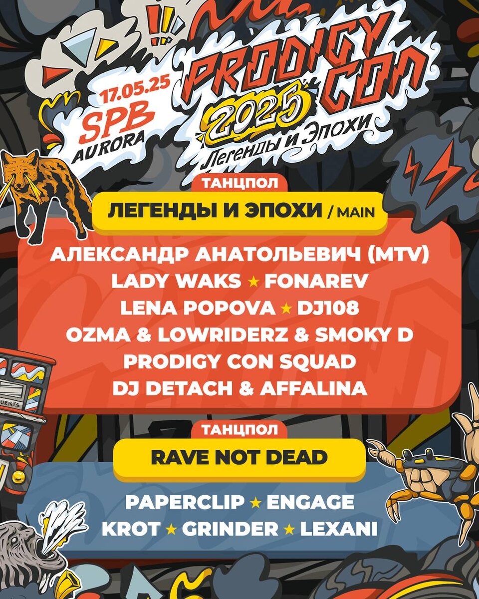 PRODIGY CON 2025 @ AURORA (СПБ) 17 мая с 23:55 | 2 танцпола Prodigy Con - крупнейший в мире мультиформатный фестиваль электронной музыки, посвященный творчеству The Prodigy. Рейв вне жанровых рамок. ⭐ Lineup: Александр Анатольевич (MTV) / Lady Waks / Fonarev / DJ108 / Lena Popova / Ozma & Lowriderz & Smoky D / Prodigy Con Squad / Paperclip / Krot / Engage / Grinder / Lexani / DJ Detach & Affalina Подробности в канале @prodigycon 🎟 Купить билет 📆 17 мая с 23:55 📍 Aurora, Санкт-Петербург, Пироговская наб., 5/2