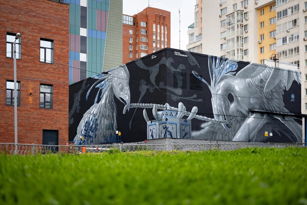 #Екатеринбург В Екатеринбурге ожили фарфоровые птицы от художника из Китая 🦅 На улице Попова, 31 появилась огромная работа от художника Кэ Юйчьжэня, работающего под псевдонимом Nut. На двух поверхностях фасада теперь красуются фигуры птиц из китайского фарфора. На пернатых можно смотреть в отдельности — каждая стенка самостоятельна и выглядит законченной. Но полностью сюжет разворачивается с угла здания — две птицы сталкиваются в одном мурале, объединяемые образом традиционного китайского фонаря 🏮 Сам Кэ Юйчжэнь считает, что герои мурала — птицы-секретари — соответствуют Екатеринбургу: «Очень красивая птица. Мне кажется, что она подойдет этому городу. Она не только красивая, она с характером: сочетает в себе силу и изящество». Особенность творчества китайского автора заключается в изображении героев работ в особой фактуре — они напоминают замершие в моменте статуэтки. Это оммаж на китайский расписной фарфор или лазурный фарфор — традиционный для китайской декоративно-прикладной