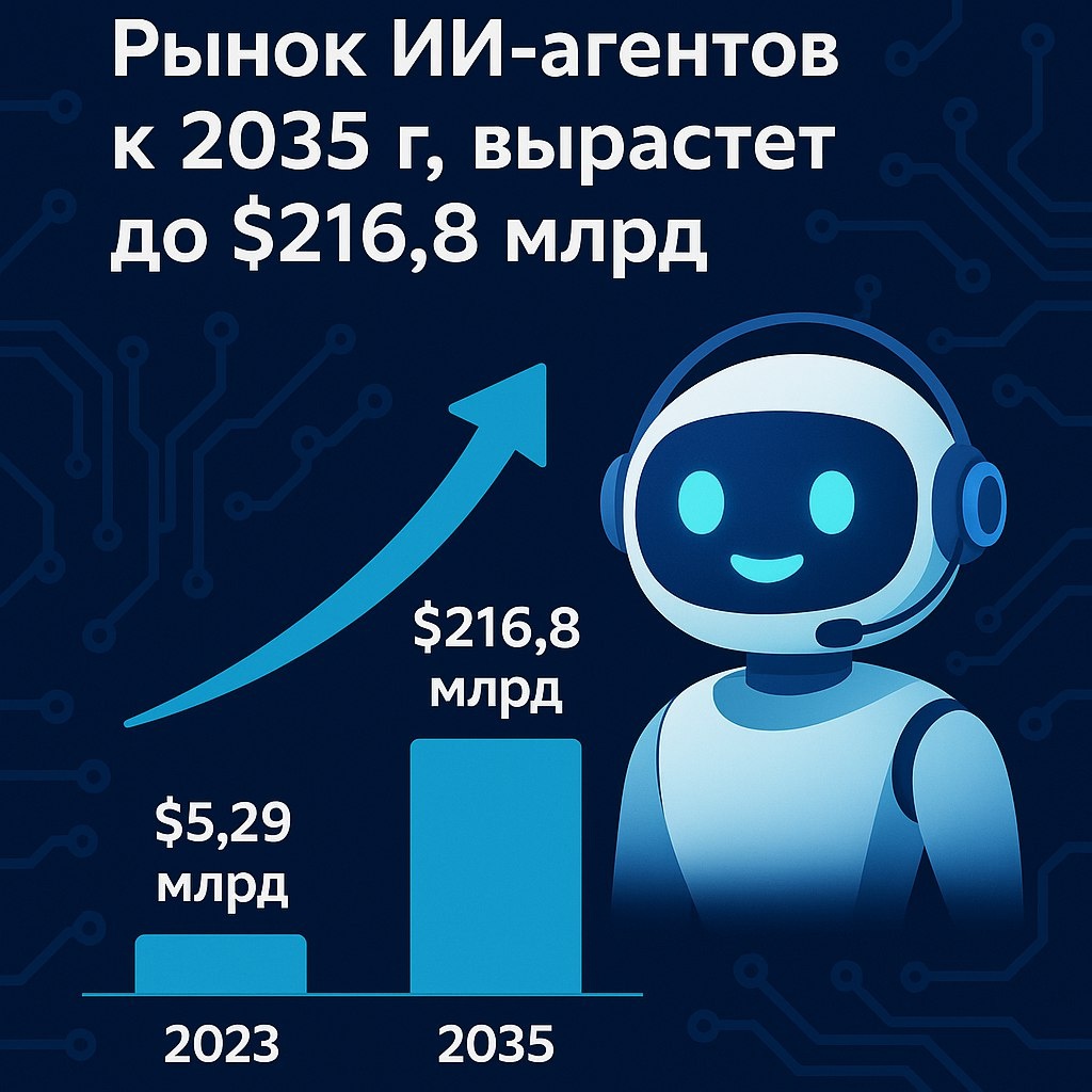 Рынок ИИ-агентов к 2035 г. вырастет до $216,8 млрд Согласно недавнему рыночному отчету, объем глобального рынка ИИ-агентов увеличится с $5,29 млрд в 2023 г. до $216,8 млрд к 2035 г., что соответствует среднегодовому темпу роста (CAGR) в 40,15 %. Этот рост обусловлен развитием технологий обработки естественного языка и растущим спросом на персонализированный клиентский опыт. ИИ-агенты становятся неотъемлемой частью таких отраслей, как обслуживание клиентов, здравоохранение и финансы, поскольку организации стремятся оптимизировать операции и повысить вовлеченность пользователей.