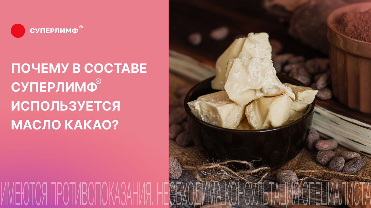 Масло какао ценят не только кондитеры, но и фармацевты. Оно давно используется в медицине благодаря своим природным свойствам. Рассказываем, как оно работает и какую роль играет в составе комплексного препарата Суперлимф®. Натуральная и безопасная основа Масло какао — растительный жир, который получают из бобов Theobroma cacao. Оно стабильное и плавится при температуре тела, быстро доставляя лекарственные вещества, поэтому масло какао часто используют в свечах и мазях. Поддержка при воспалении и инфекциях Масло какао обладает антимикробным эффектом и может снижать проявления воспалений. Его компоненты подавляют рост некоторых бактерий, связанных с заболеваниями слизистых оболочек. Помощь в восстановлении Благодаря содержанию антиоксидантов и жирных кислот, масло какао поддерживает здоровье кожи и слизистых. Оно помогает удерживать влагу, защищает от внешних воздействий и способствует естественным процессам регенерации. Часть комплексного подхода В препарате Суперлимф® масло какао выпол