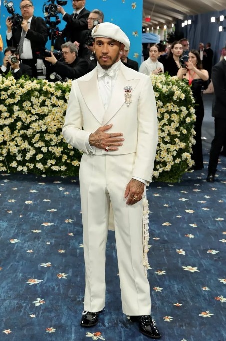 Гонщик Формулы-1 Льюис Хэмилтон. В его костюме всё имело смысл. Создали костюм в Wales Bonner. Грейс Уэльс Боннер - основоположник бренда - как раз очень увлечена в своей работе темой идентичности чернокожих мужчин.