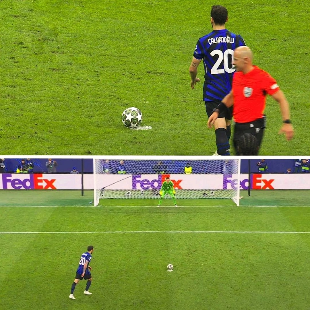 Во вчерашнем матче Лиги чемпионов вспыхнул новый судейский скандал: второй гол миланского «Интера» был забит после нарушения правил, которое почему-то осталось вне поля зрения арбитра. На фото отчётливо видно, что хавбек Хакан Чалханоглу установил мяч не на 11-метровую отметку, а явно левее центра. Это уже по правилам — ошибка, которая могла повлиять на исход эпизода.