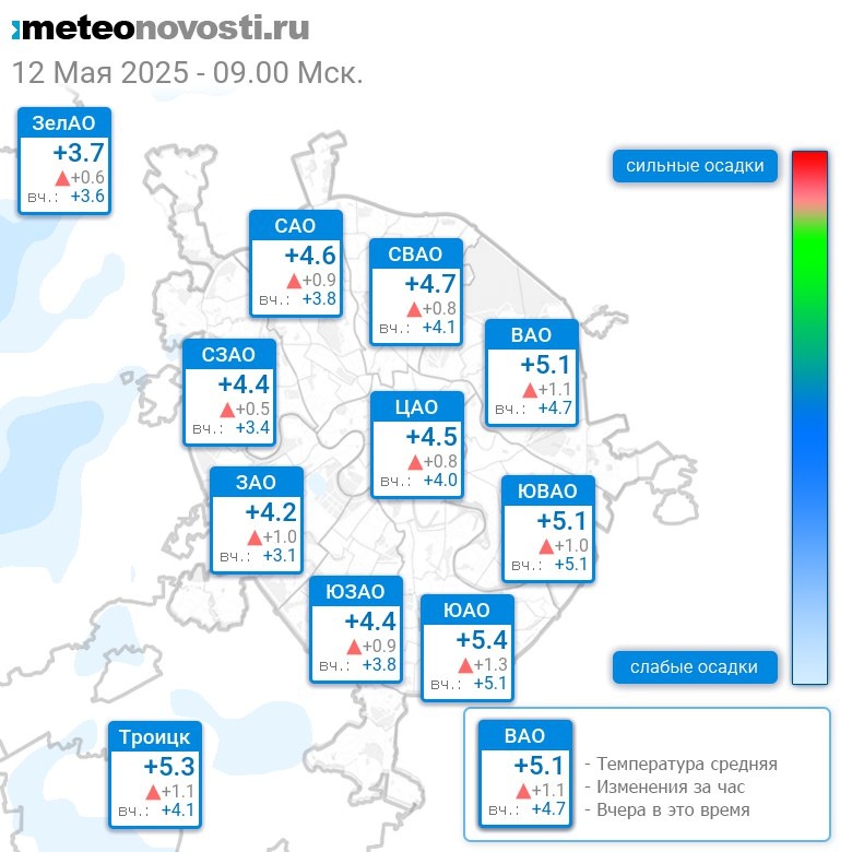 В 9:00 в Москве было от +3.2°C до +6.1°C, средняя температура +4.7°C #погода #Москва #весна #температура #12мая #понедельник
