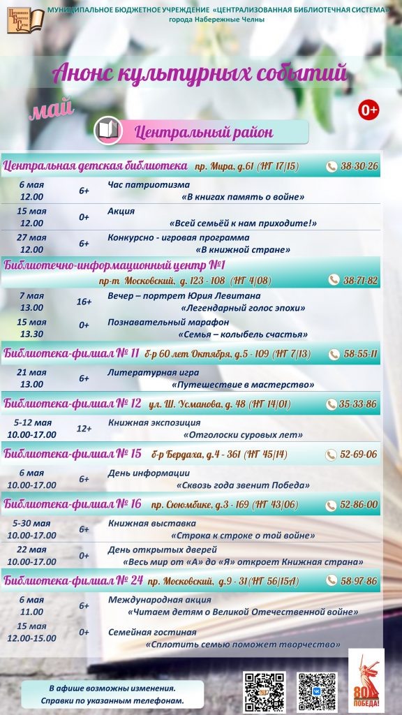 ‼Обратите внимание: расписание может незначительно меняться. Для получения точной информации о мероприятиях обращайтесь по указанным контактам в библиотеки-филиалы. Контакты на странице Библиосеть.