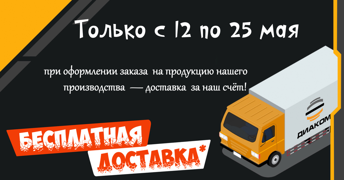 В честь Дня Победы — бесплатная доставка*! Мы благодарим вас за доверие и в честь праздника запускаем акцию «Май— Время Побед!» С 12 по 25 мая при оформлении заказа на продукцию нашего производства — доставка за наш счёт! Условия участия: * Акция действует на заказы, оформленные в период с 12 по 25 мая включительно;
