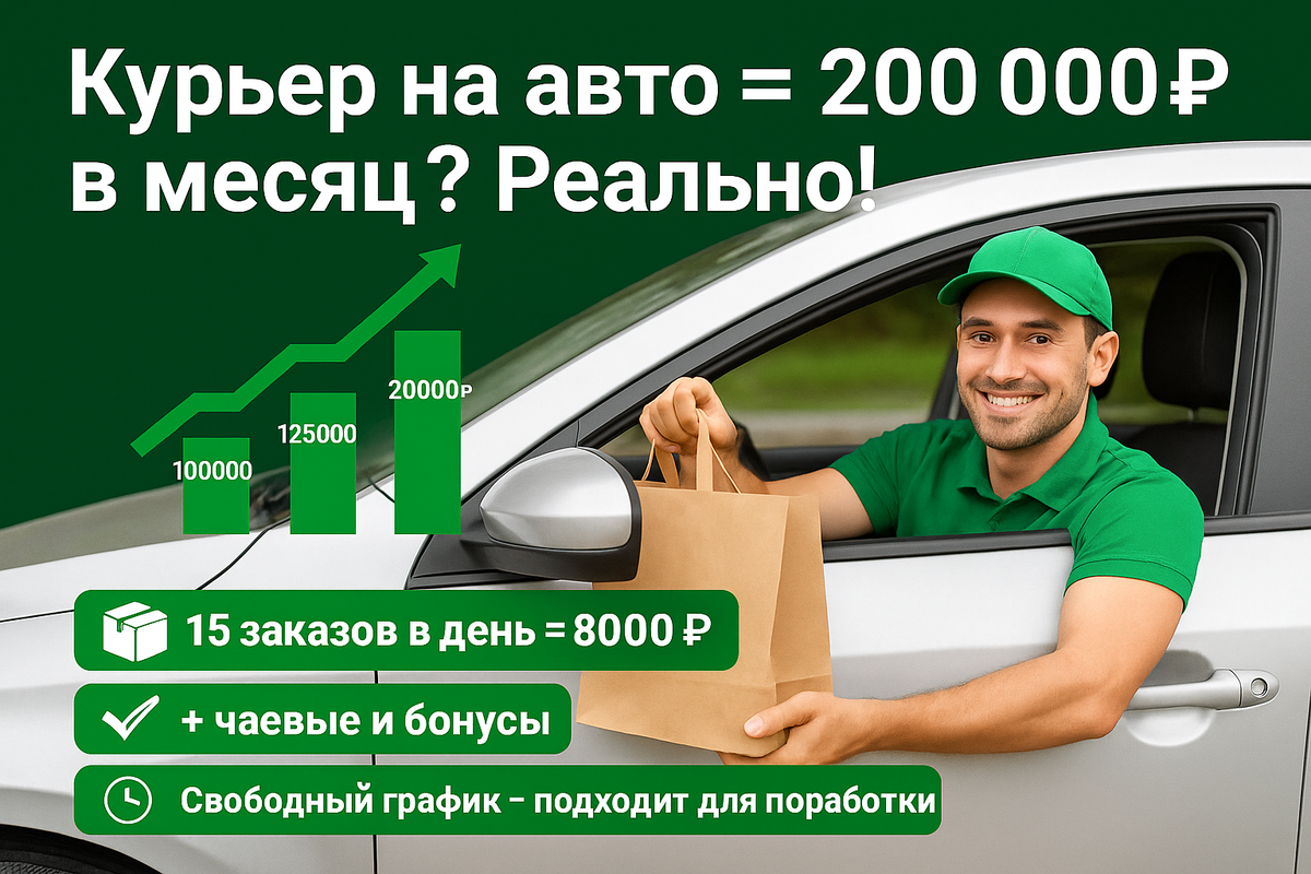 🎁 Бонусы за выполнение плана ~ 1 000 ₽ Итого за смену: 8 000 ₽ Выходит, за месяц активной работы (20–25 смен) можно заработать 200 000 рублей. Работайте в часы пик – утро (8:00–11:00), обед (12:00–15:00), вечер (18:00–22:00). ✔ Гибкий график – работайте когда удобно.