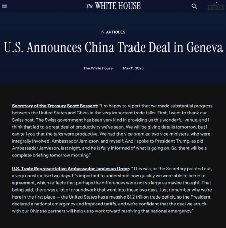 США и Китай заключили перемирие. Начинается перезапуск бычьего цикла? Вчера Белый дом официально подтвердил: США и Китай достигли торгового соглашения в Женеве. Подробности пока не раскрыты, но по заявлениям министра финансов Скотта Бессента и торгового представителя Джеймисона Грира, разговоры прошли “продуктивно” и “напряжение между сторонами ослабевает”. США ранее объявляли режим чрезвычайной торговой ситуации на фоне $1.2 трлн дефицита и вводили тарифы. Теперь — похоже, шаг назад. Что-то явно сдвинулось. К чему это может привести? — Ослабление напряжения между США и Китаем — Потенциальная отмена или смягчение тарифов — Снижение инфляционного давления в США — Укрепление мировых цепочек поставок — И, возможно, дальнейшее ослабление доллара А теперь самое интересное. Что это значит для нас, инвесторов? Если доллар продолжит слабеть, как он делает последние месяцы — это прямой сигнал для роста рисковых активов. Биткойн, акции, сырьё — всё, что давно ждёт “разморозки”. Мир прив