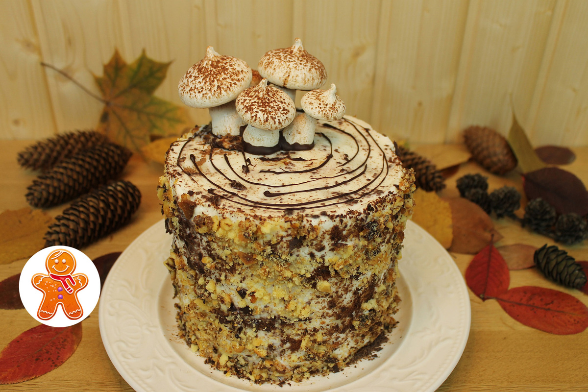 Тертый шоколад для украшения торта и склеивания грибочков из безе ПРИГОТОВЛЕНИЕ: Разделите яйца на белки и желтки, желтки пойдут в тесто, а из белков приготовим меренги для украшения торта. Сухие дрожжи разведите в небольшом количестве теплой воды. Если для разрыхления теста будете использовать разрыхлитель, смешайте его с мукой. Для теста слегка взбейте яичные желтки, добавьте сметану, сахар, разведенные дрожжи, растопленное сливочное масло и все размешайте до однородности. Вмешайте пр