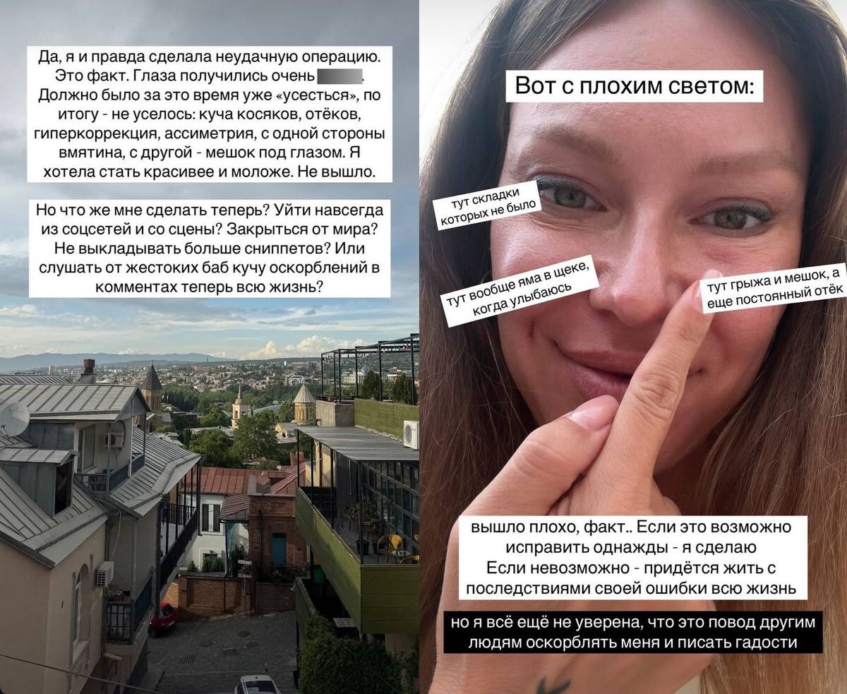 Артистка открыто рассказала о своем опыте после очередной волны критики в соцсетях — поводом стала ее новая песня «Я у себя есть», посвященная принятию себя. По словам Дакоты, она решилась на процедуру, чтобы освежить внешний вид и обрести «лисьи глазки», но результат оказался далек от ожиданий. Вместо желаемого эффекта певица столкнулась с отеками, асимметрией и другими проблемами. «В комментах открылся просто портал в ад. Десятки девочек писали мне, какая я страшная, какая я уродина, какая я монголка, как я ужасно себя переделала, какая у меня неудачная операция», — рассказала певица. Ранее Дакота пыталась скрыть неудачную пластику при помощи фильтров, освещения, ракурса, кепок и солнцезащитных очков, но на этот раз опубликовала честное фото, на котором видны все изъяны — заломы, бугристость, отечность, мешки под глазами. Фото: соцсети / @ritadakota Певица не скрывает, что сейчас ей тяжело: она до сих пор не знает, удастся ли исправить последствия вмешательства. Однако сдаться она не