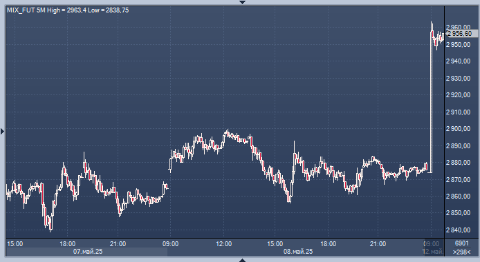 Президент Украины Владимир Зеленский принял решение лететь в Стамбул независимо от того, какое решение примет Россия относительно прекращения огня с 12 мая. Об этом пишет Axios со ссылкой на украинского чиновника. График фьючерса на индекс Мосбирди интервалами в 5 минут В понедельник на российском фондовом рынке наблюдается значительный рост, который связан с позитивными новостями из Украины и США. 15 мая президент России Владимир Путин сообщил, что Россия готова возобновить прямые переговоры с Украиной без каких-либо предварительных условий. Встреча должна состояться в Стамбуле. «Предлагаем киевским властям возобновить переговоры, прерванные ими в конце 2022 года. Возобновить прямые переговоры, причем, подчеркну, без всяких предварительных условий. Начать предлагаем без промедления уже в следующий четверг, 15 мая, в Стамбуле. Там, где они проводились ранее, и там, где они были прерваны», — сказал Путин в воскресенье в ходе общения с журналистами. Как заявил президент России, Москва го