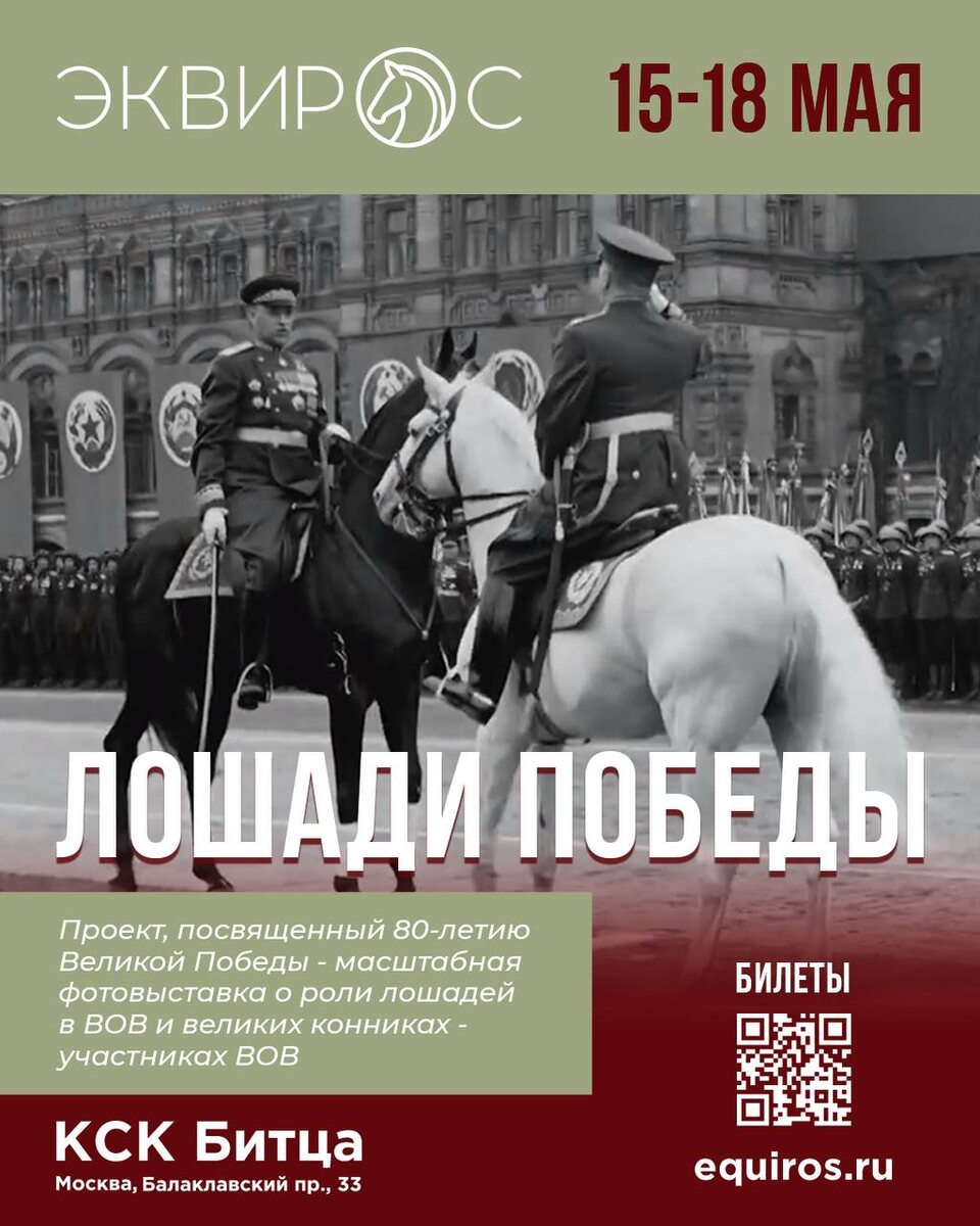 Фотовыставка «Лошади Победы» пройдёт в КСК Битца! Вторая мировая война вошла в историю как «война моторов». Но лошадиные силы работали не только в двигателях танков, автомобилей и самолетов. Они также напрямую участвовали в приближении Великой Победы. Лошади разделили с людьми весь ужас военных лет. Вместе с людьми они шли в атаки, вместе с людьми они преодолевали многокилометровые марши. Они бились под Москвой и прорывались в блокадный Ленинград, стояли насмерть под Сталинградом и освобождали Крым, принимали цветы и благодарности от жителей европейских городов и участвовали в Параде Победы под стенами Кремля. Вместе с людьми они трудились в тылу, вместе с людьми терпели тяготы эвакуации. Получали ранения, голодали, работали из последних сил, погибали… Но главное – победили! Тоже вместе с людьми. История показала, не только что лошадь заняла свое место в этой войне, но и что больше ей на войне не место. И мы не имеем права забывать о последнем грандиозном военном подвиге этого сильн