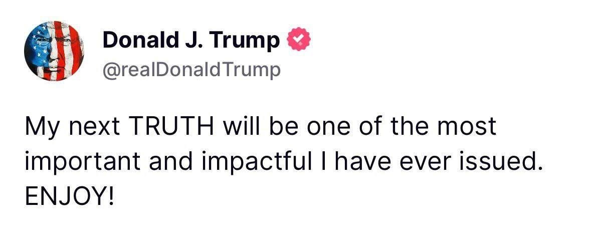 🤑 Новый токен от Трампа? Вчера Дональд Трамп опубликовал загадочный пост в своей социальной сети Truth Social: «Мой следующий пост в TRUTH будет одним из самых важных и влиятельных, которые я когда-либо делал. НАСЛАЖДАЙТЕСЬ!» Слово TRUTH он выделил капсом — и это может быть не случайно. Ранее уже ходили слухи, что Трамп готовит новый токен, связанный с его компанией Trump Media. 🙂 Сообщество уверено: это был намёк. Ждём анонса — памп может быть мощным.