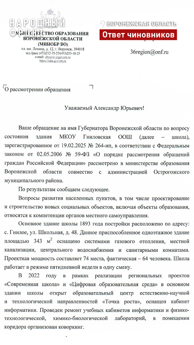 Об этом в ответ на обращение Народного фронта сообщили в министерстве образования Воронежской области. Разработан долгосрочный план развития Острогожской сельской агломерации. По этому плану возведение новой школ в селе Гнилое запланировано на 2030-2031 годы. Профинансируют стройку в рамках одного из федеральных проектов Минсельхоза РФ.