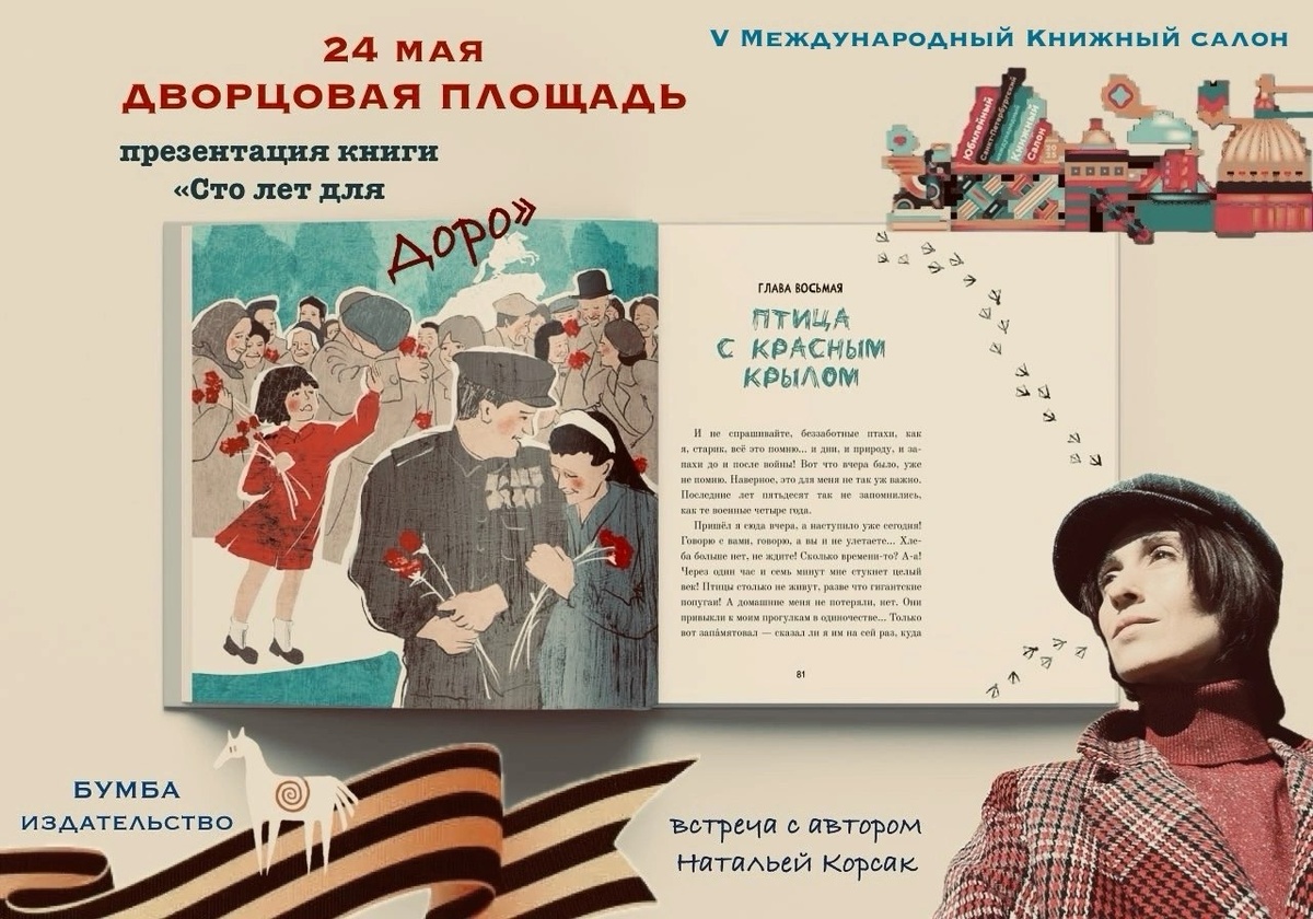 ✨ Спешите увидеть! Презентация книги Натальи Корсак! Встреча с писателем и журналистом Натальей Корсак состоится на Дворцовой площади Петербурга в программе Книжного салона 24 мая в 14.00. Автор презентует новую долгожданную книгу «Сто лет для Доро», перенесется с гостями на страницы этой яркой трогательной истории, оживит иллюстрации и конечно, не обойдется без полёта! Также на встрече гости познакомятся с иллюстратором книги — талантливым российским художником Анастасией Нагирной. Погружение в историю родной страны, секреты создания легенды и приятные сюрпризы для самых активных участников встречи обеспечены! "Все будет сказочно, а дети полюбят свою страну ещё больше!", — отмечает Наталья. Наталья Корсак — участник проекта «Завтрашние классики: воспитание через слово», реализуемого Союзом детских и юношеских писателей при поддержке Президентского фонда культурных инициатив.